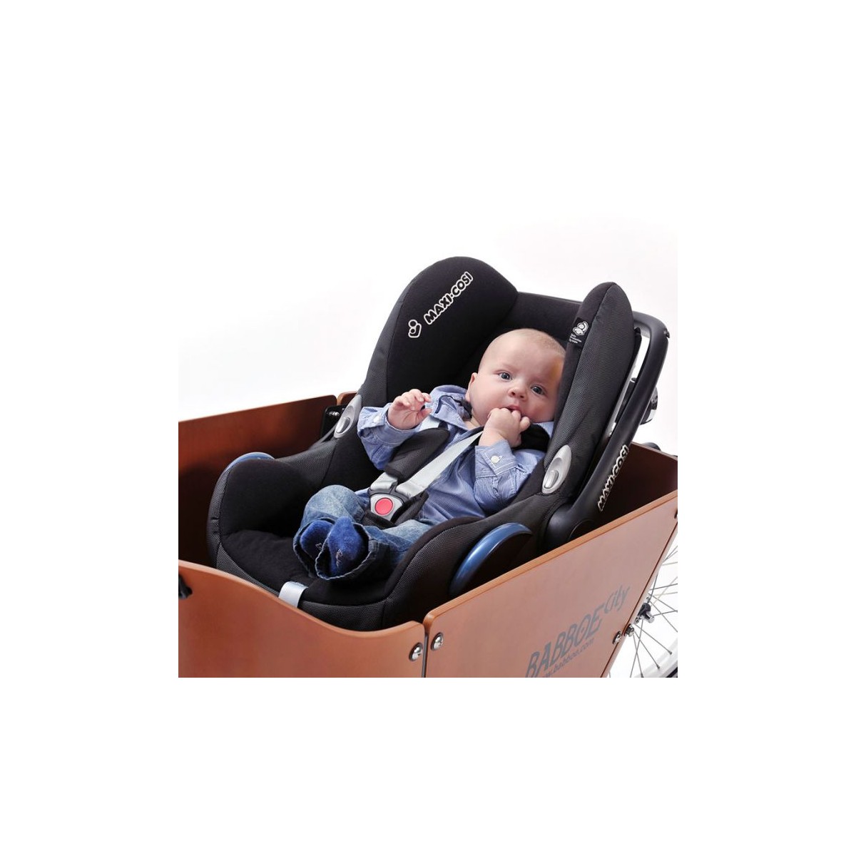 Avec le support maxi cosi de Steco, vous pouvez transporter facilement et en toute sécurité votre bébé dans le vélo cargo dès ses 3 mois (lorsque son cou est suffisament fort).